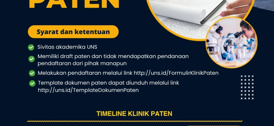 Pendaftaran Klinik Paten akan dibuka pada tanggal 25 Juni – 14 Juli 2024 melalui link https://uns.id/FormulirKlinikPaten. Bagi inventor yang akan mendaftar, diharuskan mengirimkan draft paten yang sesuai template yang dapat didownload melalui link https://uns.id/TemplateDokumenPaten.