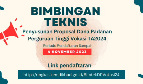 Jangan lewatkan! Segera daftar dan ikuti kegiatan Bimbingan Teknis penyusunan Proposal Dana Padanan (Matching Fund) Perguruan Tinggi Vokasi TA 2024 untuk periode pendaftaran sampai 4 November 2024. Pendaftaran bisa dilakukan melalui http://ringkas.kemdikbud.go.id/BimtekDPVokasi24 KUOTA TERBATAS!!!!!!!!!!!!!!!Read More →