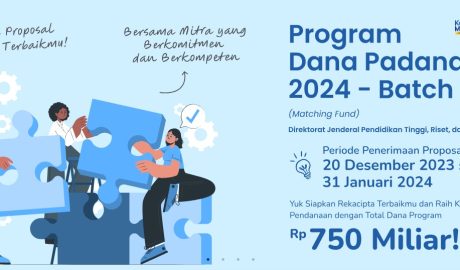 Setelah terlaksananya Program Dana Padanan (Matching Fund) Tahun 2023, Direktorat Jenderal Pendidikan Tinggi, Riset, dan Teknologi kembali membuka penerimaan proposal Program Dana Padanan Tahun 2024 bagi para Insan Dikti dalam rangka mengakselerasi peningkatan mutu dan relevansi pendidikan tinggi di Indonesia melalui pembentukan ekosistem kolaborasi antara Perguruan Tinggi dengan Dunia Usaha,Read More →