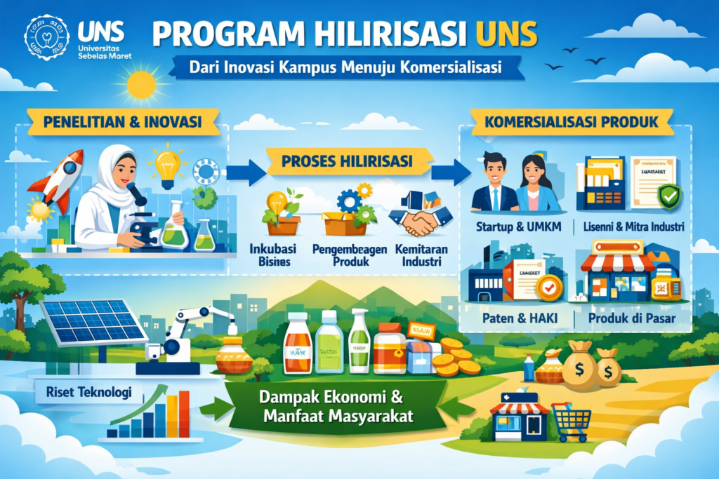Berdasarkan pada acuan Permenristek DIKTI no 29 tahun 2019 tentang pengukuran dan tingkat kesiapan teknologi, perguruan tinggi perlu mendorong proses hilirisasi produk hasil penelitian sehingga dapat digunakan oleh masyarakat. Program Hilirisasi UNS (PHU) merupakan tindak lanjut dari program hibah inovasi teknologi UNS (PIT) yang telah mencapai TRL 6 untuk mendorong pemanfaatan hasil riset perguruan tinggi melalui kolaborasi berkelanjutan dengan mitra DUDI (Dunia Usaha dan Industri). Pada program ini ditekankan adanya mekanisme pembiayaan bersama, saling berkontribusi, dan kolaborasi untuk mempercepat masuknya hasil riset menjadi produk inovasi sosial maupun komersial yang berdampak. Program Hilirisasi UNS (PHU) diprioritaskan bagi inventor dan mitra yang telah memiliki kerja sama sebelumnya, dengan tujuan memperkuat kemitraan berkelanjutan serta meningkatkan daya saing inovasi nasional.