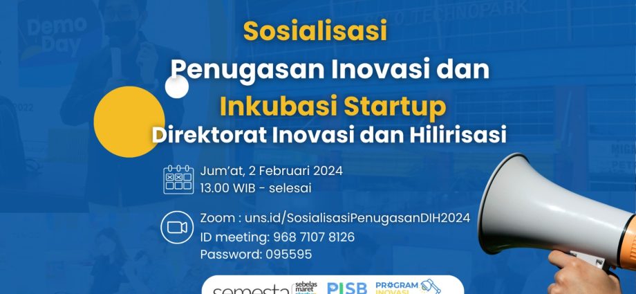 Untuk lebih mengenal dan memahami Program Penugasan Inovasi dan Inkubasi Stratup tersebut, kami mengundang seluruh sitivitas akademika UNS dan alumni pada acara “Sosialisasi Penugasan Inovasi dan Inkubasi Startup Direktorat Inovasi dan Hilirisasi” secara daring, yang akan dilaksanakan besok pada: